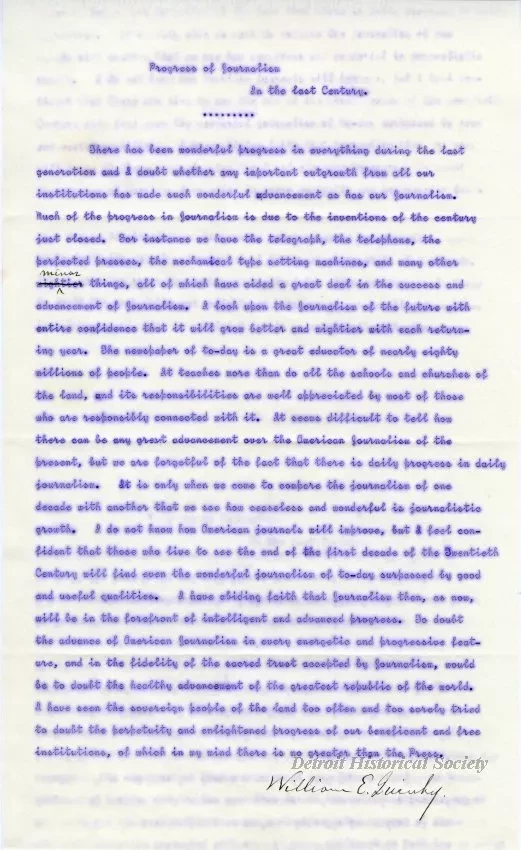 1-page letter written by William E. Quinby, President of the Detroit Free Press. It is a blue carbon copy which was typewritten onto thin linen paper and has the watermark, "S & B Paragon Linen, Made In U.S.A." The writer has signed in black ink, "William E. Quinby."