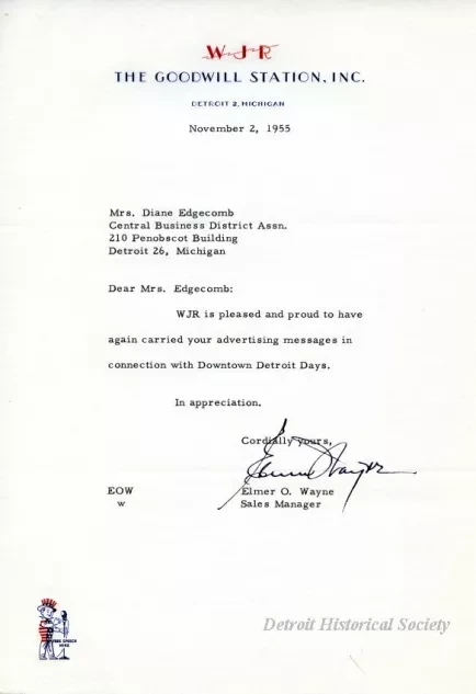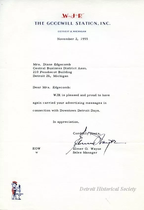 One letter of appreciation to Mrs. Diane Edgecomb of the Central Business District Association of Detroit from Elmer O. Wayne, Sales Manager, of WJR Radio. The letter, dated November 2, 1955, is printed in black typewritten text on white linen paper that is watermarked "Parsons Laconia Bond, 75% Cotton Fiber." Red and blue letterhead text at the top of the page shows "WJR, The Goodwill Station, Inc., Detroit 2, Michigan." A small red, white, and blue drawing in the lower left corner of the page shows an Uncle Sam figure with a microphone and the words "Free Speech Mike."