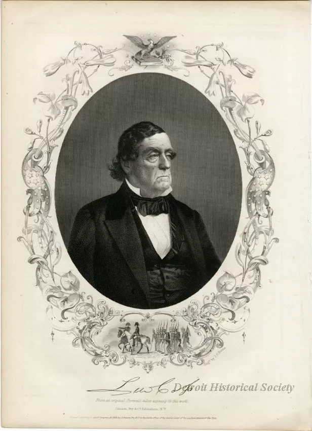 Head-and-shoulder portrait lithograph of Lewis Cass, by J.C. Buttre and printed by Johnson, Fry, and Company of New York. Cass is depicted in a dark suit and tie looking to the right. The oval-shaped portrait is surrounded by a border composed of scrollwork and images of an eagle perched atop a book beneath a semi-circle of stars, and of two War of 1812-era officers on horseback leading marching soldiers. Lewis Cass' signature is printed at the bottom.