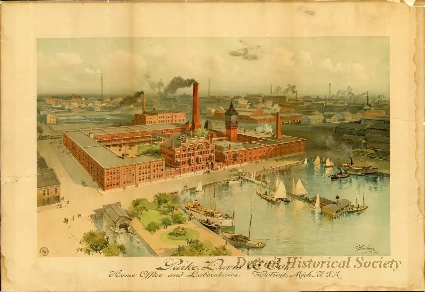 Color lithograph mounted on board. Title at bottom reads "Parke, Davis & Co., / Home Office and Laboratories, Detroit, Mich., U.S.A." The lithograph shows a painting of the Parke-Davis campus (now River Place), at the foot of Joseph Campau Street along the Detroit River with a view to the southeast. Several boats are docked in the foreground of the image, and pedestrians and horse drawn carriages are shown along the perimeter of the Parke-Davis facilities. A circular logo on the bottom left indicates that the lithograph was printed by The Winters Art Litho. Co. of Chicago.