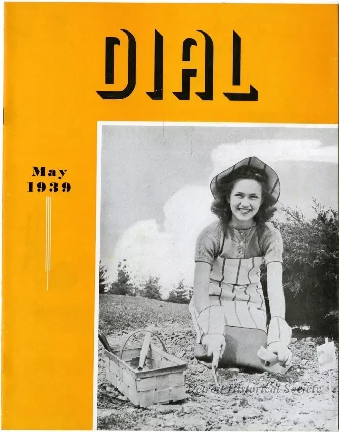One softcover "Dial" monthly magazine published by the students of Mackenzie High School in Detroit. The title text on the cover is printed in black ink on a contrasting dark yellow background. There is a black and white photo of a girl gardening on the cover. The magazine contains 16 pages of school-related articles, games, and ads. It also includes photographs and names of students who were members of various school clubs and teams. The magazine was dated May, 1939.