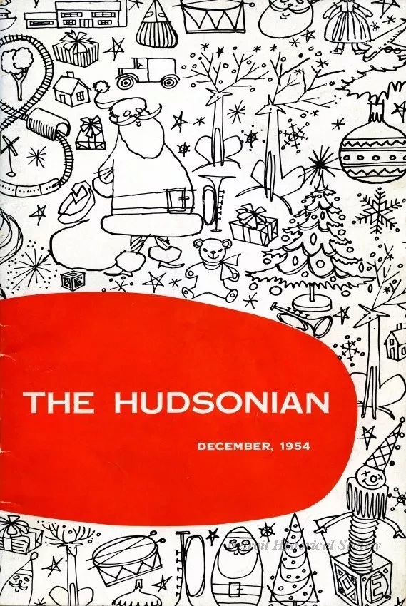 One copy of the December, 1954, issue of "The Hudsonian," the J. L. Hudson Company employee magazine. The cover features a pen and ink illustration of toys and Christmas decorations. The 40-page, booklet-style magazine contains a short article about the recent Thanksgiving Day Parade as well as short articles concerning department news, employee activities, awards, anniversaries, and retirements. Many black and white photographic images are included with the text.