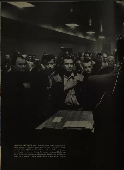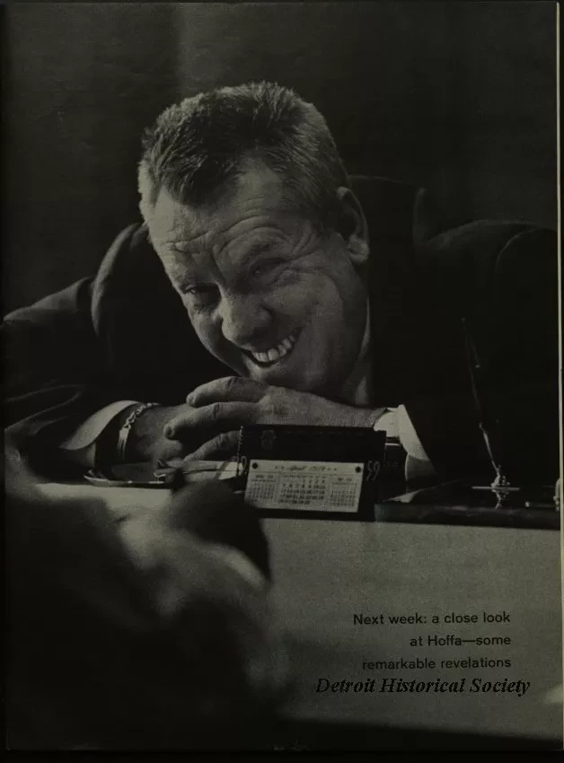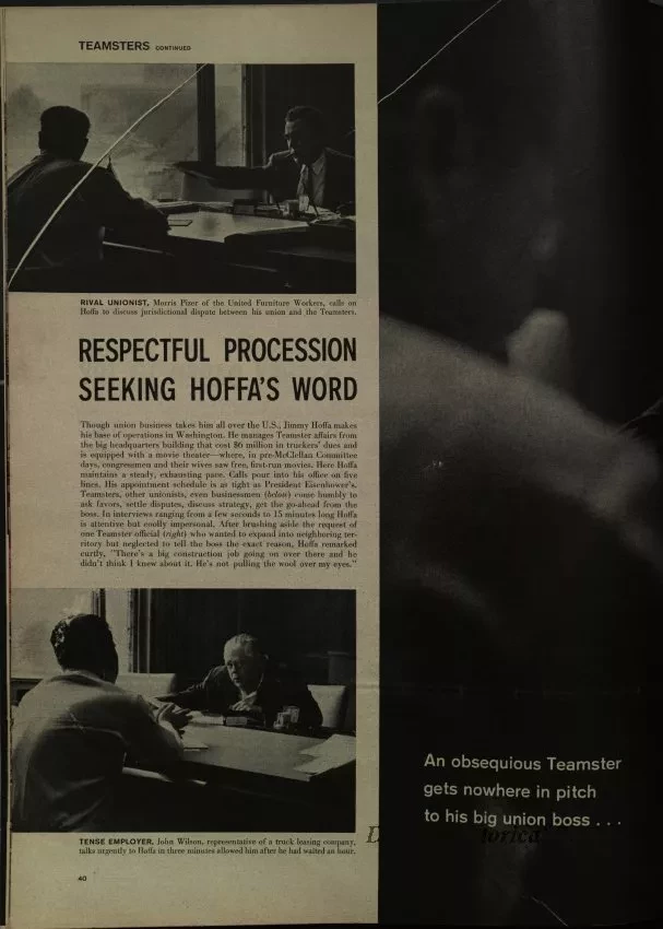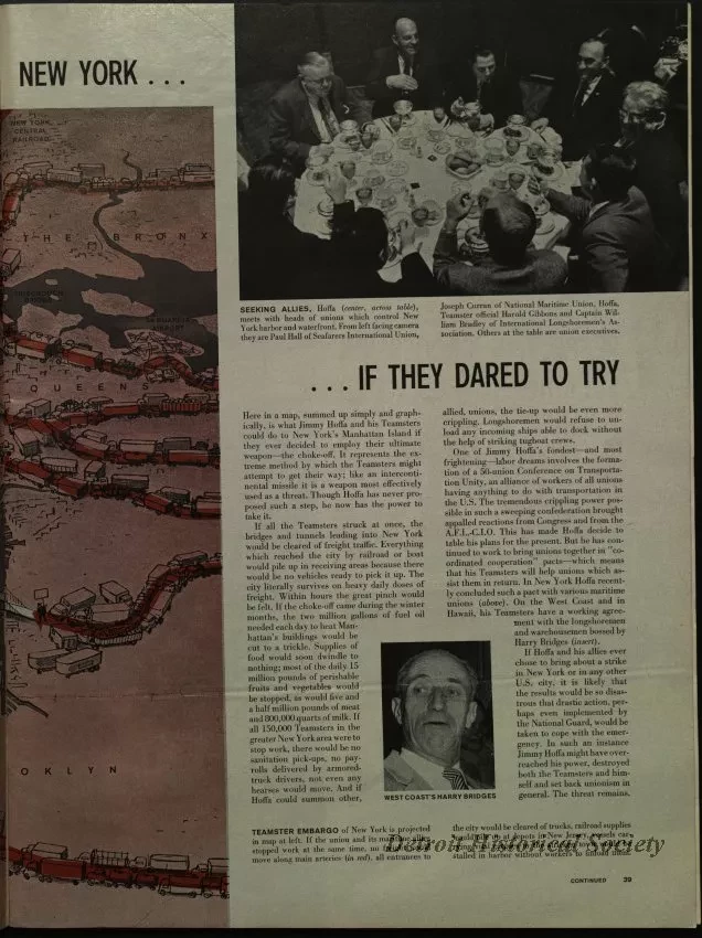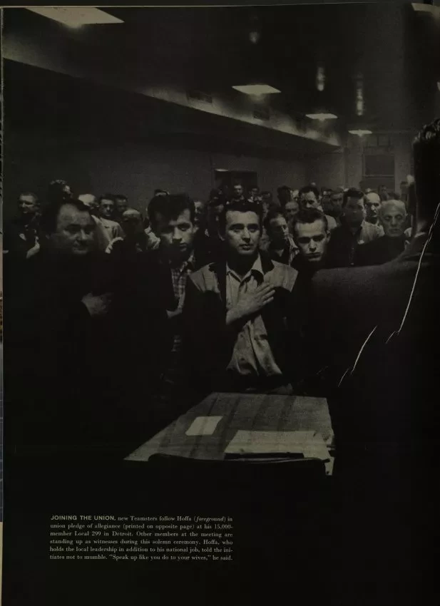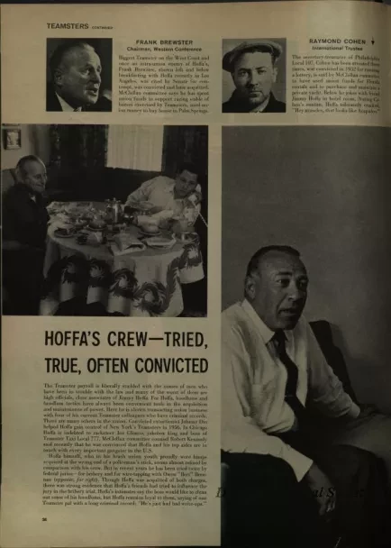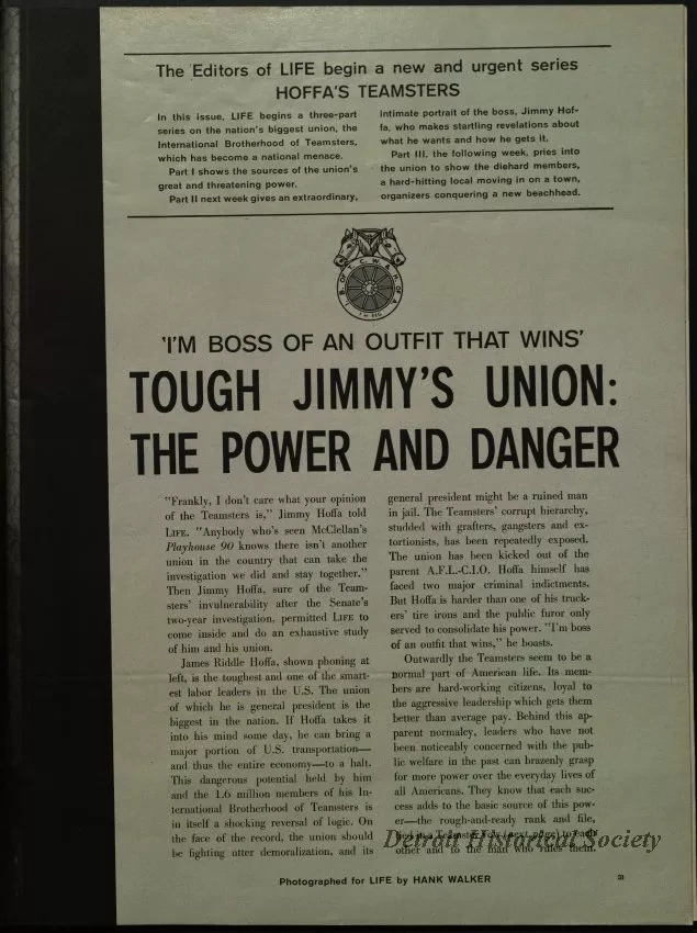 May 18 1959 issue of Life Magazine containing the cover story, A National Threat: Hoffa's Teamsters, Part 1: Sources of a Union's Uncurbed Power." Jimmy Hoffa is pictured on the cover reflected in a truck's rear view mirror against a background of other trucks, with the caption "Jimmy Hoffa: Teamster Boss in the Field."