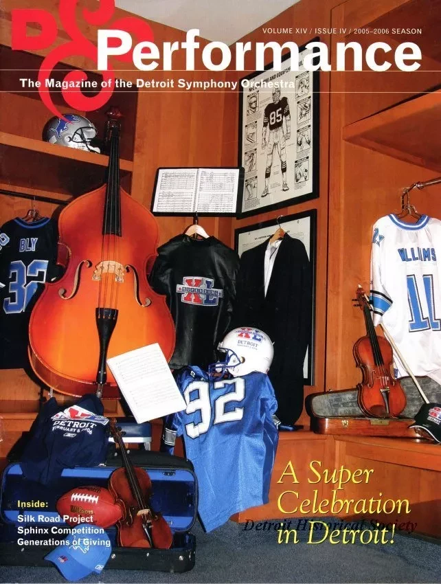 Detroit Symphony Orchestra 2005-05 magazine titled, "Performance." The cover story is titled "A Super Celebration in Detroit!" The issue is printed in full color and staple bound. It includes brief articles about the band, program notes for different shows, the schedule for the year, and a list of the year's sponsors on the last couple pages. Cover features a photograph of Super Bowl XL memoribilia, Detroit Lions gear, and a bass and violin in the Lions dressing room.