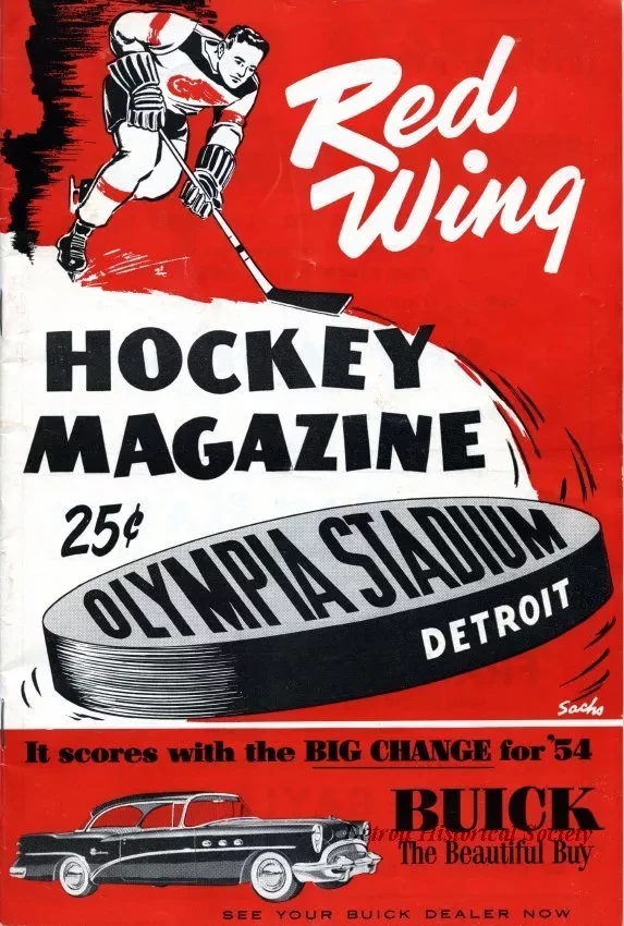 One magazine entitled "Red Wing Hockey Magazine" which was published by Olympia Stadium. The cover has black/white text on a red background and shows a black/white drawing of a hockey player and a large puck. The magazine contains 34 pages of black printed text on white paper with short articles about the Detroit Red Wings team and players as well as many advertisements. Several black and white photographic images are included with the text.