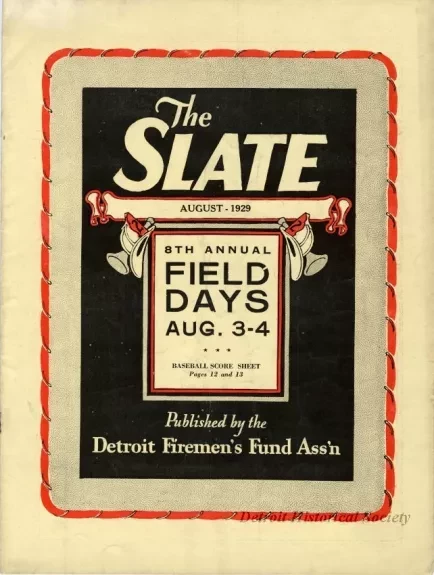 August 1929 issue of The Slate, published by the Detroit Firemen's Fund Association. The cover and several columns inside are dedicated to the group's 8th Annual Field Days, on August 3rd and 4th at Navin Field. The magazine also includes a score sheet for the event's baseball game, which has been filled in with pencil Photos of city officials, Fire Commissioners, and chiefs are also contained within along with stories of interest to firefighters and advertisements.