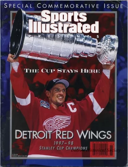 Special Commemorative Edition of "Sports Illustrated Presents" about the Detroit Red Wings winning the 1998 Stanley Cup. Within is a history of the team, features on Gordy Howe, Scotty Bowman, Vladmir Konstantinov, Nicklas Lidstrom, Chris Osgood, Steve Yzerman, and a look back at the team's 1997 victory. "6/24/98, display until 9/21/1998," is printed on the front cover, along with a photo of Steve Yzerman holding aloft the Stanley Cup.