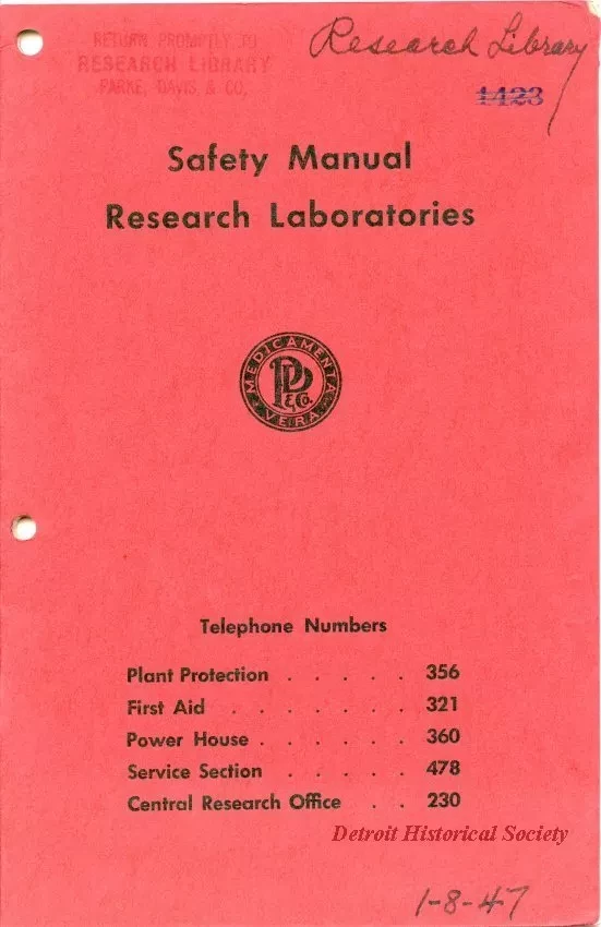 Safely manual for the research laboratories of Parke, Davis & Co. Includes the following sections: General, Biological, Chemical, Service.