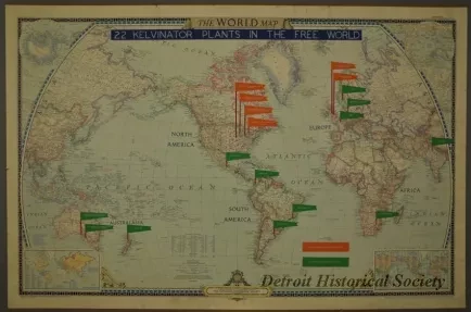 Mounted December 1951 world map printed by the National Geographic Society, upon which has been affixed the title label, "22 Kelvinator Plants in the Free World," as well as eighteen pennant-shaped labels marking the locations of Kelvinator factories. Five of the labels are orange indicating that they are Kelvinator-owned planets, while the other twelve are green, representing licensed manufacturers.