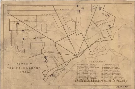 1 - blueprint map entitled: "Detroit Thrift Gardens 1932." The map shows major roads and city boundary lines as well as the locations of 26 "Thrift Gardens." A numbered legend in the lower right corner of the sheet gives the names of cross streets for each garden location. The gardens were generally located toward the west, southwest, and northeast city limits.
