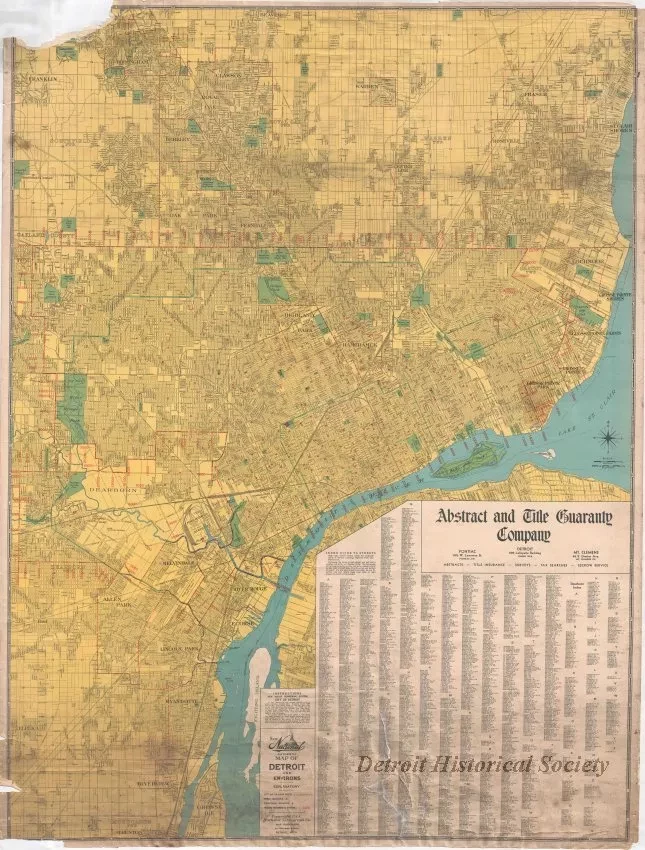 One street "Map of Detroit and Environs" that was published by the National Lithograph Company. The multicolor map is printed on paper at an approximate scale of 1.6 inches = 1 mile. It shows streets, street names, city and township boundaries, section numbers, railroad lines, schools, and address numbering in the region. One inset advertisement near the right edge promotes the "Abstract and Title Guaranty Company." An alphabetical index of street names is shown in the lower right area of the map.