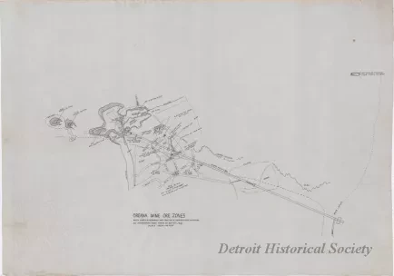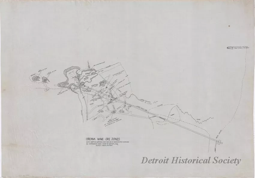 Hand-drawn map of the ore zones at the Champion Sillimanite, Inc. mine in Oreana, Nevada, with surface workings and a portion of underground workings. All underground work shown by doted lines.