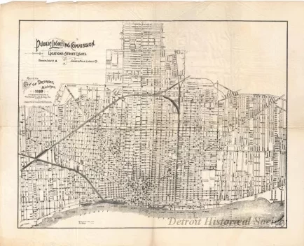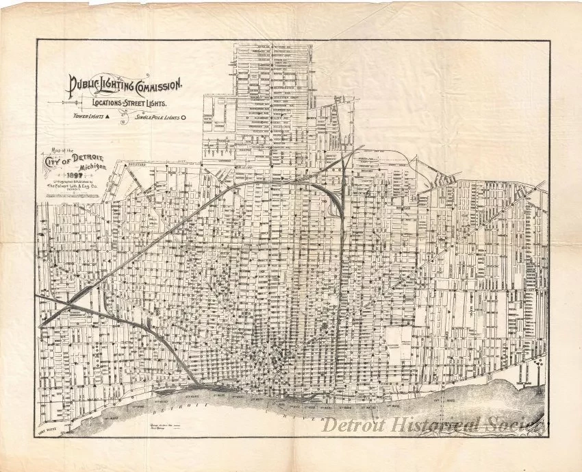 One map entitled "Public Lighting Commission, Locations of Street Lights." The map is printed in black ink on thin vellum paper and shows the locations of single pole lights and tower lights throughout the city. Streets, street names, railroad lines, and ward boundary lines are also shown. The map was "Lithographed & Published by the Calvert Lith. & Eng. Co., Detroit" and is dated 1897.