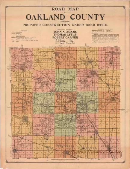 One map entitled "Road Map of Oakland County Showing Proposed Construction Under Bond Issue." The color map shows the names of cities, towns, and townships throughout the county as well as existing and proposed roads. Section numbers are also shown for each township. The map indicates various roads that were to be built as part of a "Two Mill Tax (1916)" and a separate primary and secondary bond issue. The names of Road Commission officials are listed at the top of the map: "John A. Adams, Thomas Lytle, Robert Garner" and "M. DeGlopper, Eng'r.; F. B. Babcock, Clerk; S. C. Rogers, Deputy Clerk."