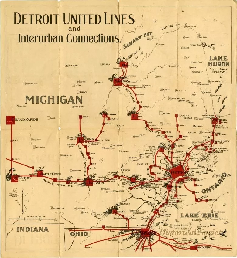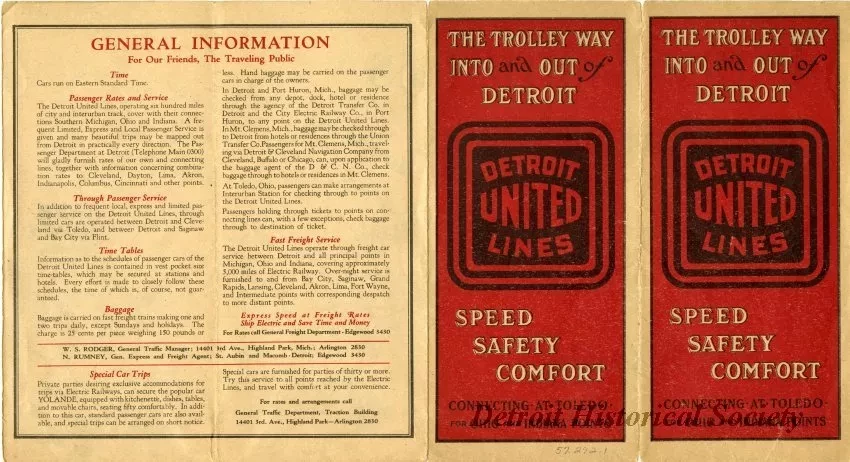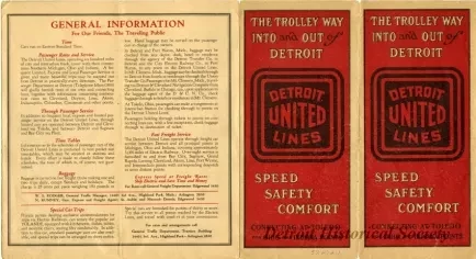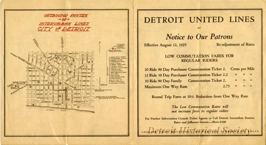 Eight panel folded Detroit United Lines interurban streetcar service map. The interior shows a map of routes for southern Michigan and parts of Ohio. The verso is printed with a map of lines in downtown Detroit, a notice of new rates effective August 12, 1925, and general information about Detroit United Lines.