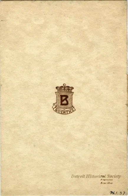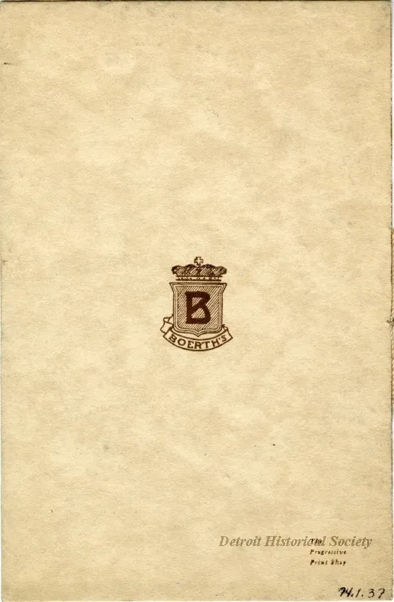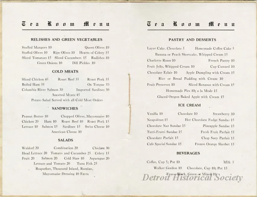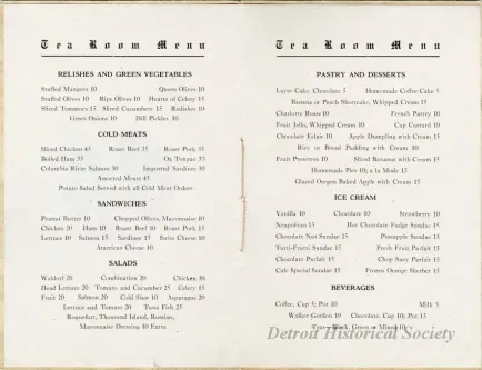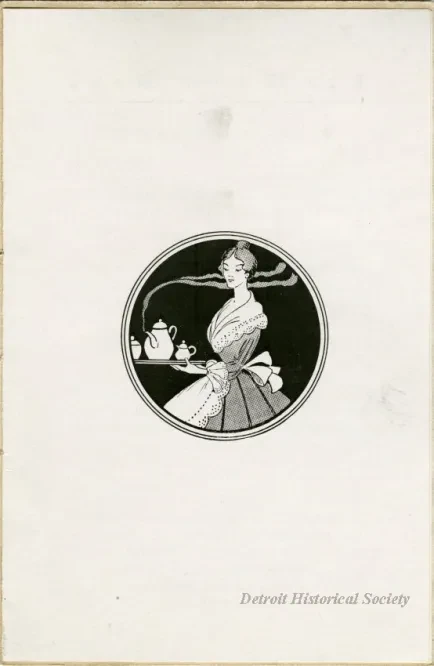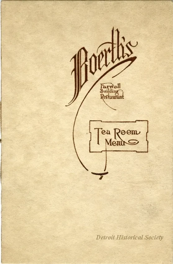 Tea room menu booklet from Boerth's in the basement of the Farwell Building on Griswold Street. The booklet is bound in a beige cover with thread, and includes an illustration of a woman carrying a tea tray, as well as listings for "Relishes and Green Vegetables," "Cold Meats," "Sandwiches," "Salads," "Pastry and Desserts," "Ice Cream," and "Beverages" within.