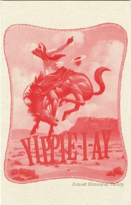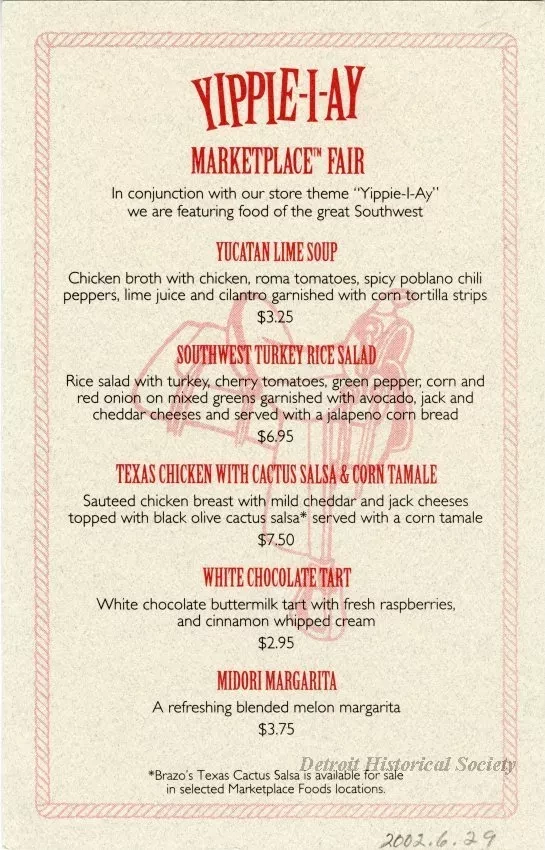 Hudson's "Yippie-I-Ay Marketplace Fair" menu sheet. An image of a cowboy riding a bucking horse above the text, "Yippie-I-Ay," is on the recto. A menu of five southwestern themed offerings is listed on the verso,