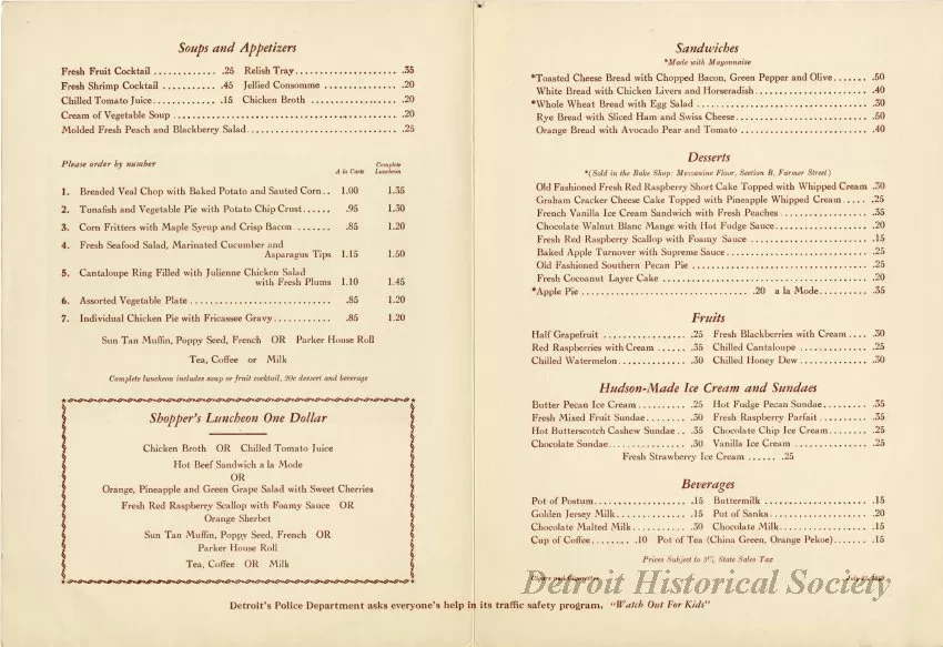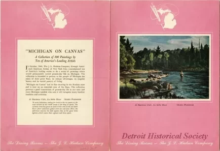 Half-folded J.L. Hudson Company Dining Rooms menu, dated July 21, 1949, bearing the painting "At Rainbow Club, Au Sable River," by Ogden Pleissner on the front cover surrounded by a pink border. The painting depicts a fly fisherman at the Rainbow Club on the Au Sable River near Grayling and was part of the Michigan on Canvas touring exhibit put together by the J.L. Hudson Company. A passage on the back cover explains both the exhibit and the painting. Within the menu is divided into the sections "Soups and Appetizers," "Shopper's Luncheon One Dollar," "Sandwiches," "Desserts," "Fruits," "Hudson Made Ice Cream and Sundaes," and "Beverages." A note along the bottom of the menu's interior informs, "Detroit's Police Department asks everyone's help in its traffic safety program, "Watch Out For Kids."