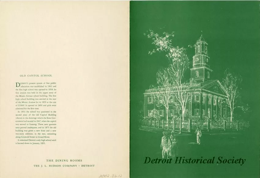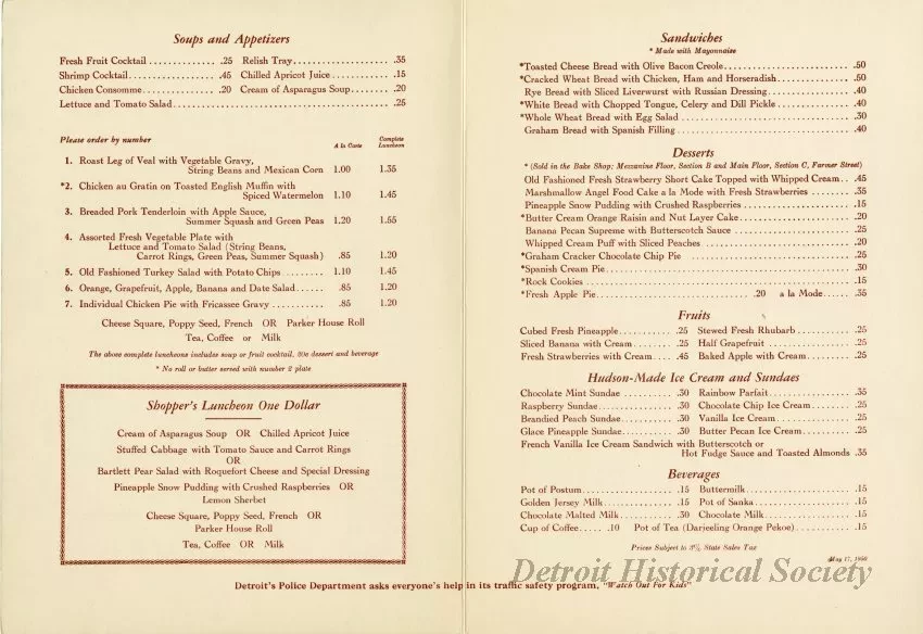Half-folded J.L. Hudson Company Dining Rooms menu, dated May 17, 1950, bearing an illustration by E.E. Anthony of Capitol Union School in white on green on the front cover. A brief passage about the school and early education in Detroit is on the back cover. Within the menu is divided into the sections "Soups and Appetizers," "Shopper's Luncheon One Dollar," "Sandwiches," "Desserts," "Fruits," "Hudson Made Ice Cream and Sundaes," and "Beverages." A note along the bottom of the menu's interior informs, "Detroit's Police Department asks everyone's help in its traffic safety program, "Watch Out For Kids."