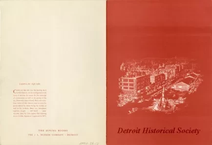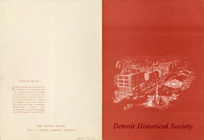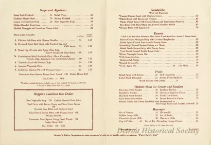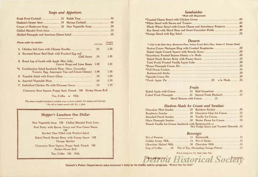 Half-folded J.L. Hudson Company Dining Rooms menu, dated March 21, 1950, bearing an illustration by E.E. Anthony of the Michigan Soldiers' and Sailors' Monument and Central Market in Cadillac Square in 1875 in white on red on the front cover. A brief passage about the market is on the back cover. Within the menu is divided into the sections "Soups and Appetizers," "Shopper's Luncheon One Dollar," "Sandwiches," "Desserts," "Fruits," "Hudson Made Ice Cream and Sundaes," and "Beverages." A note along the bottom of the menu's interior informs, "Detroit's Police Department asks everyone's help in its traffic safety program, "Watch Out For Kids."