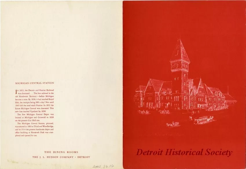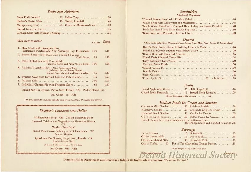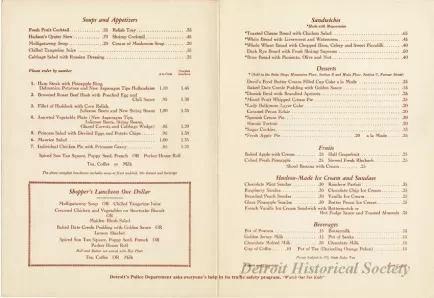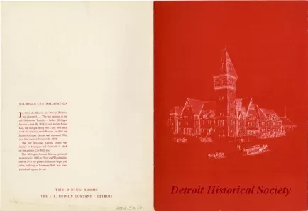 Half-folded J.L. Hudson Company Dining Rooms menu, dated March 27, 1950, bearing an illustration by E.E. Anthony of the second Michigan Central Railroad Depot on the corner of Third Street and West Jefferson Avenue in white on red on the cover. A brief passage about early railroads and train stations in Detroit is on the back cover. Within the menu is divided into the sections "Soups and Appetizers," "Shopper's Luncheon One Dollar," "Sandwiches," "Desserts," "Fruits," "Hudson Made Ice Cream and Sundaes," and "Beverages." A note along the bottom of the menu's interior informs, "Detroit's Police Department asks everyone's help in its traffic safety program, "Watch Out For Kids."