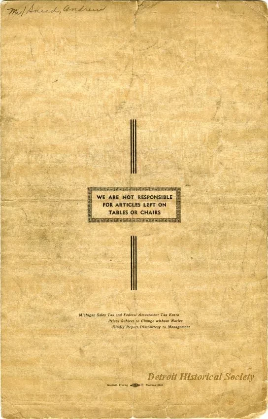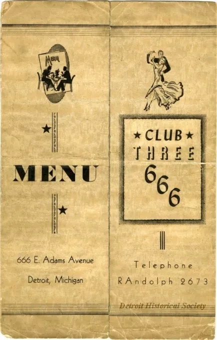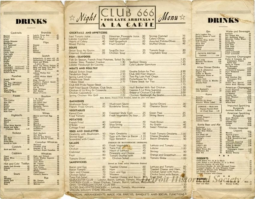 Gatefold night menu for the Club 666, located at 666 East Adams Avenue. Drinks and desserts are listed on the inside of the flaps, while the center panel lists entrees and sides. "Club 666. Night Menu. For Late Arrivals. A La Carte" is printed at the top of the center panel.