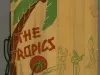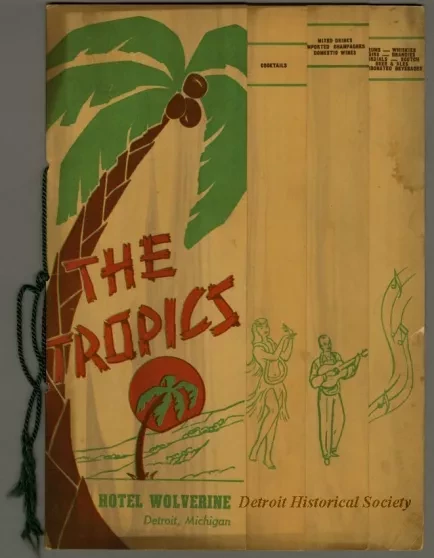 Menu form the Hotel Wolverine's tiki bar The Tropics. The menu consists of two half-folded sheets of cardstock bound with green cord and cut to create a cover with three tabbed pages--"Cocktails;" "Mixed Drinks, Imported Champagnes, Domestic Wines;" and "Rums - Whiskies, Gins - Brandies, Cordials - Scotch, Beer & Ales, Carbonated Beverages." Each page is printed with a woodgrain background. An image of two palm trees is printed on the cover. Green illustrations of a hula dancer, a man wearing a lei and playing a guitar, and a series of musical notes along a curved path are printed on the tabs.