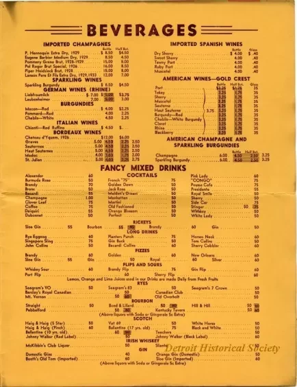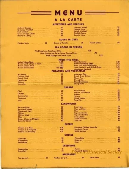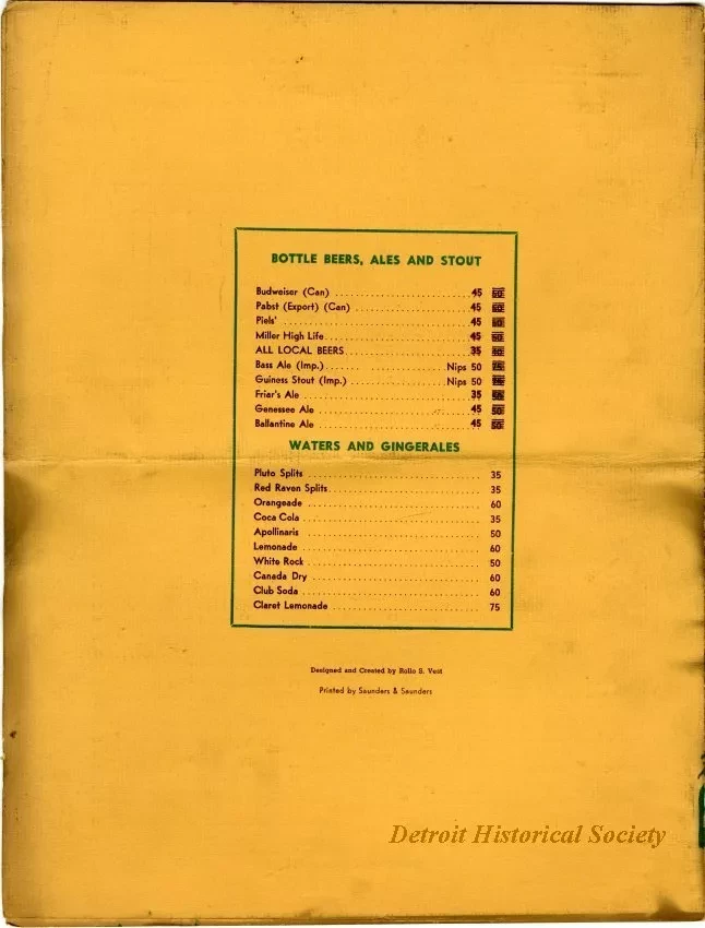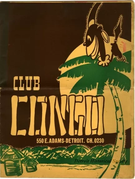 Half-folded menu from the jazz club Club Congo, printed on yellow paper with an illustration of a black face-style tribesman character in a tree on the cover. The club was within the Norwood Hotel at 550 East Adams Street, the previous site of the Plantation Club. A la carte dinner items, as well as a variety of champagnes, wines, and mixed drinks are listed within.