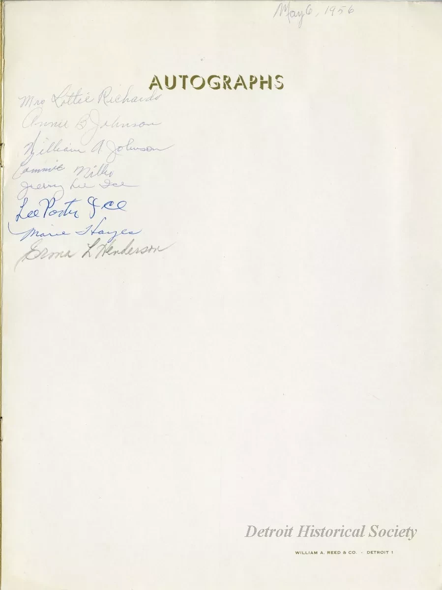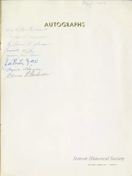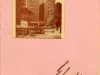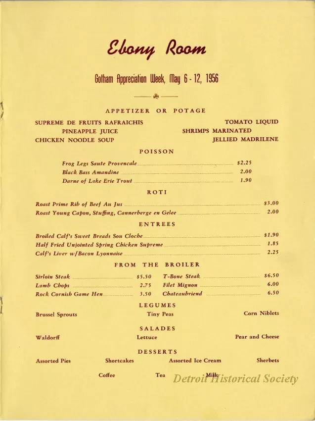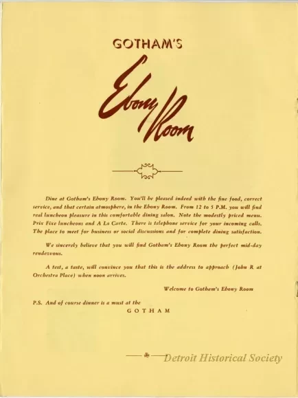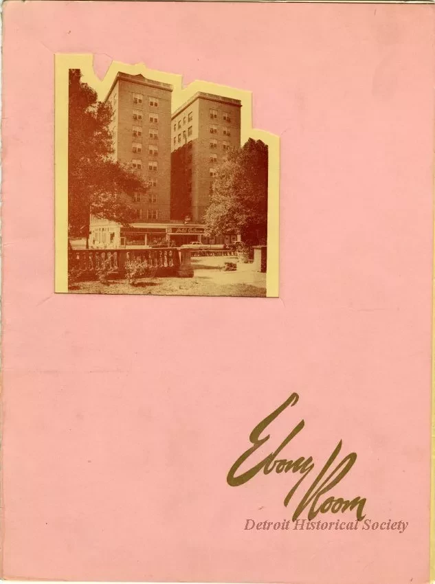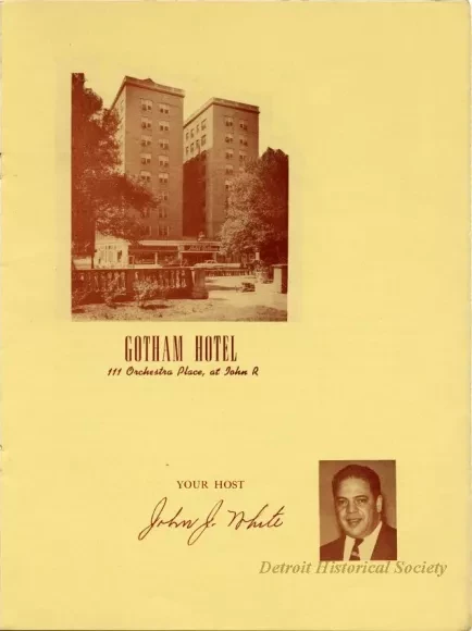 Menu for Gotham Appreciation Week at the Gotham Hotel's Ebony Room at 111 Orchestra Place spanning May 6 to 12, 1956. The menu is bound in a pink cover with a window cut revealing a half-tone brown on yellow photograph of the hotel within. The menu includes a photo the proprietor John J. White, as well as a space for autographs inside the back cover. Eight autographs have been collected, including Erma Henderson.