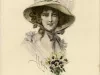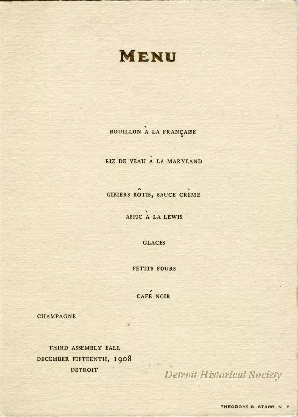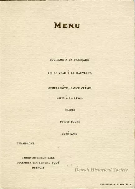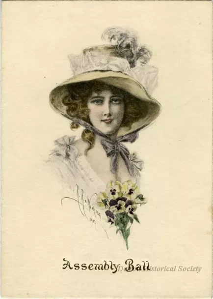 Half-folded menu from the third Assembly Ball held on December 15, 1908. A color illustration by Raimund Ritter von Wichera of a woman with a large broad-brimmed hat holding flowers is on the cover. The courses are listed within.