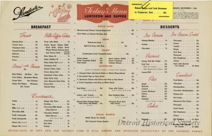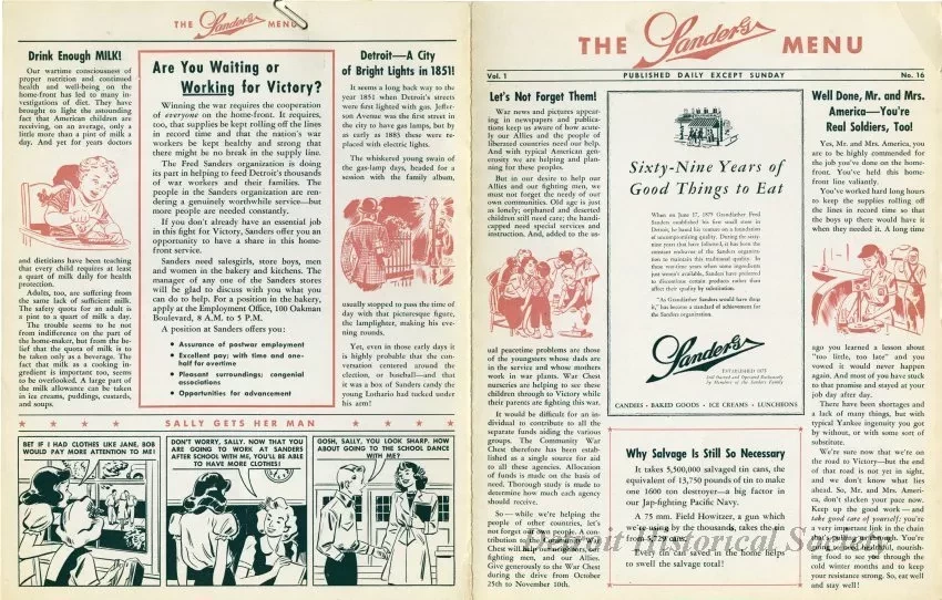Half-folded Sanders menu dated Wednesday, November 1, 1944. Articles and advertisements are printed on the front and back cover concerning the Community War Chest program, tin salvage, a message of thanks to people on the home front, the nutritional importance of dairy, Detroit's first gas lights along Jefferson Avenue in 1851, and employment at Sanders. A three-panel comic strip on the back cover tells the story of Sally, a teenage girl, who is asked to a dance by teenage boy Bob, thanks to the outfit she was able to buy after working at Sanders. Breakfast, luncheon, supper, and dessert items are listed within. A card offering, "Baked Beans and Link Sausage in Casserole, Roll 35¢," was paper clipped near the upper right corner of the interior.