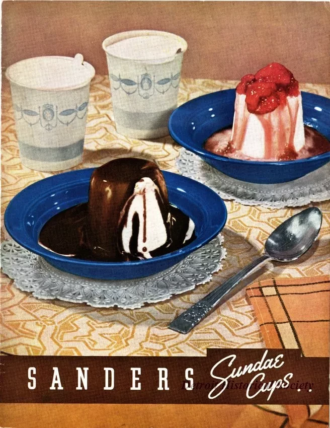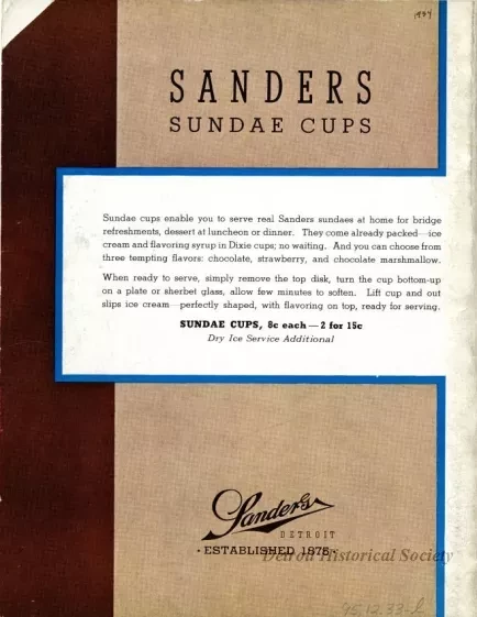 One folded Sanders menu with a blank interior. The front cover shows color pictures of chocolate and raspberry sundaes on a table. The back cover shows black text on a brown and white background that describes Sanders ready-made "Sundae Cups" that are available for sale for desserts at home.