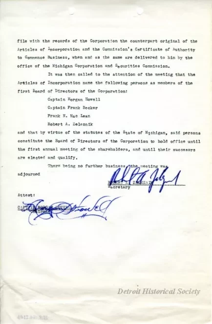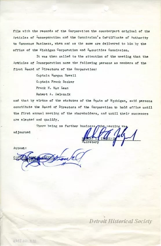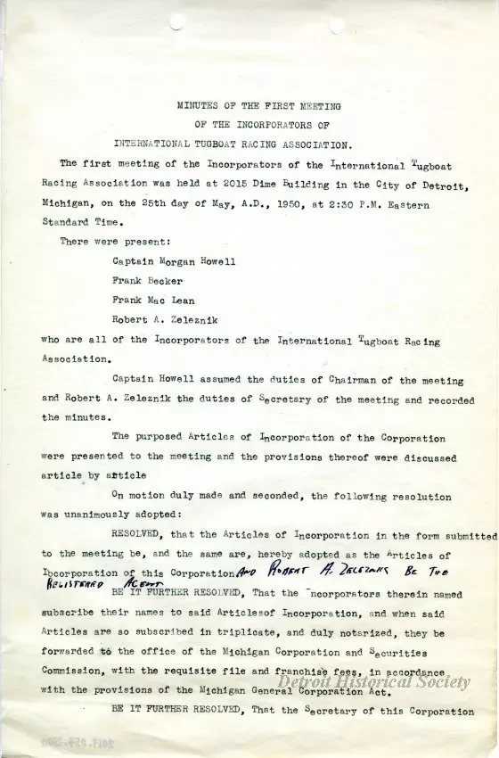 "Minutes of the First Meeting of the Incorporators of the International Tugboat Racing Association." The minutes, dated May 25, 1950, are typewritten in black text on two sheets of white paper and have been signed by the Secretary, Robert A. Zeleznik, and the Chairman, Captain Morgan Howell.