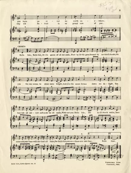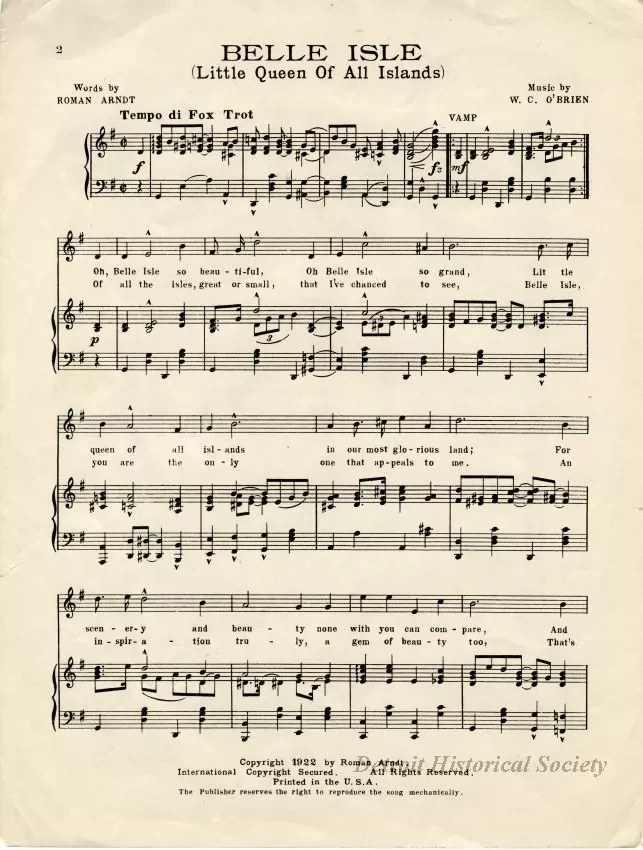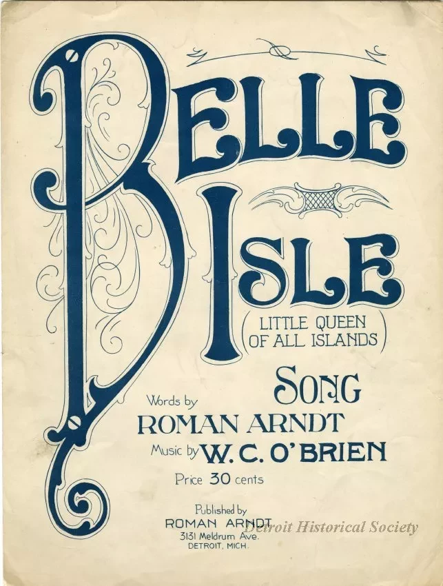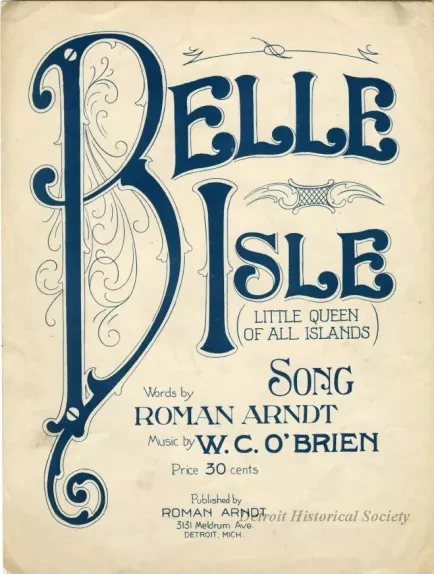 Sheet music for the song "Belle Isle (Little Queen of All Islands)", words by Roman Arndt, music by W. C. O'Brien, published by Roman Arndt.