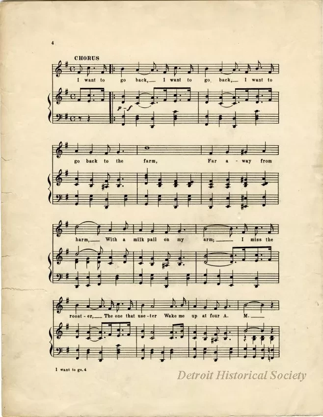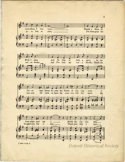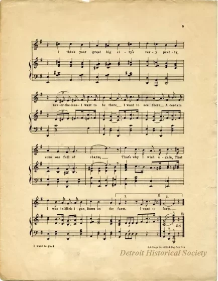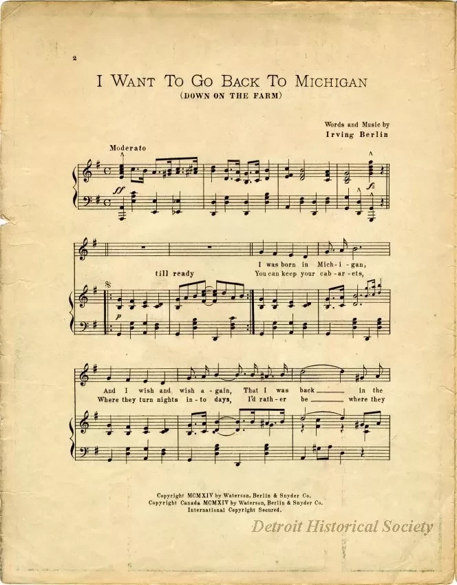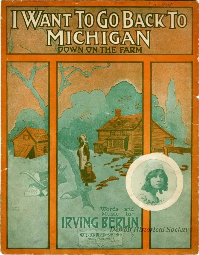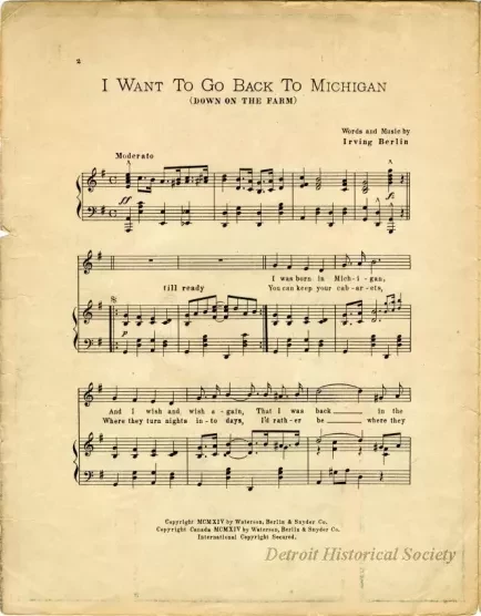 Sheet music for the song "I Want to Go Back to Michigan (Down on the Farm)", words and music by Irving Berlin, published by the Waterson, Berlin & Snyder Co., New York.