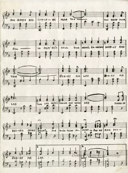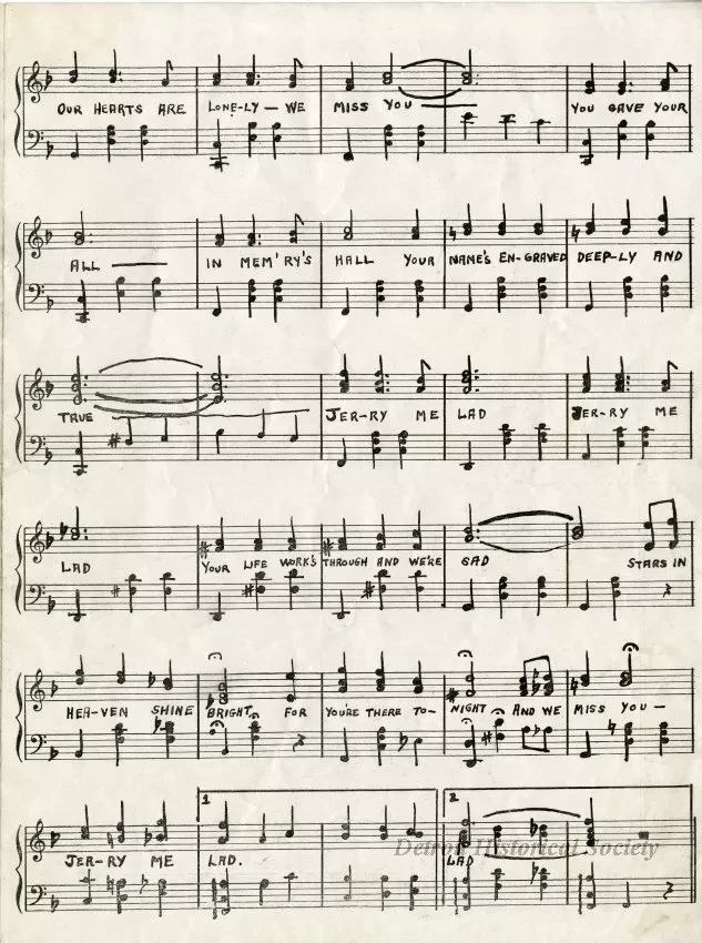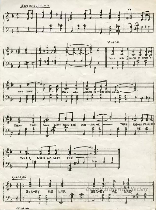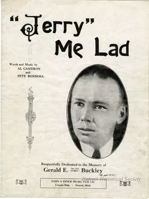 Sheet music for the song "'Jerry' Me Lad", words and music by Al Cameron and Pete Bonsema, published by the John S. Finck Music Publishing Co. Dedicated to Gerald E. Buckey.