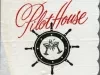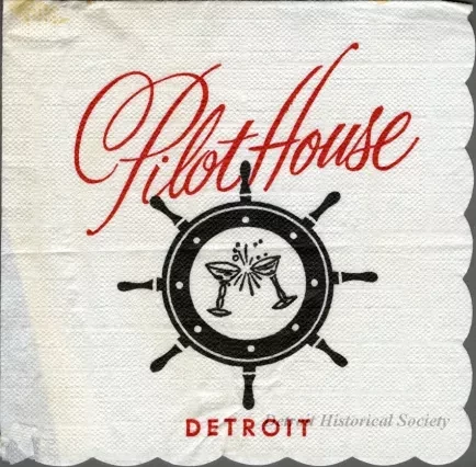 Cocktail napkin from the Pilot House. The napkin in printed in black and red with the bar's name and an image of two martini glasses clinking together framed within a ship's wheel. The napkin has scalloped edges.