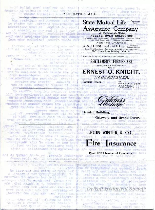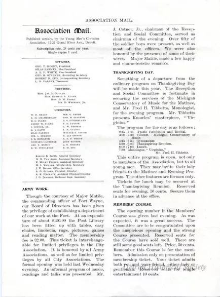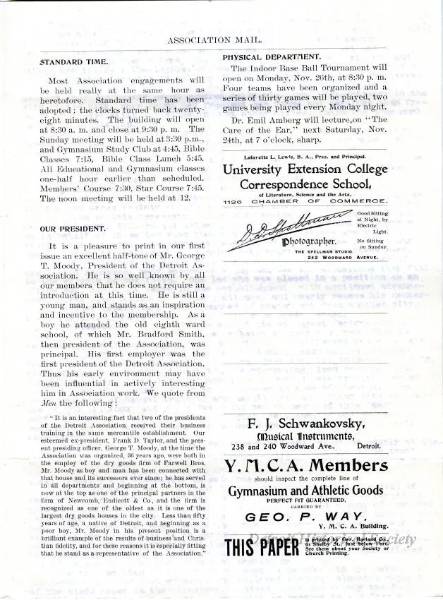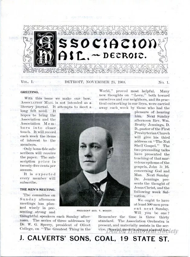 This folded 4-page newsletter is the first issue of the "Association Mail" which was published by the Detroit YMCA. The cover page shows a halftone picture of George T. Moody who was the President of the Detroit Y.M.C.A. The second page shows the names of officers, trustees, and directors. The newsletter also includes several short articles, notices, and advertisements.