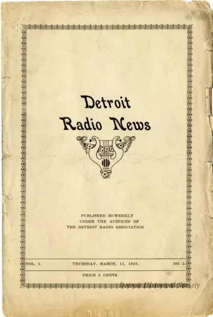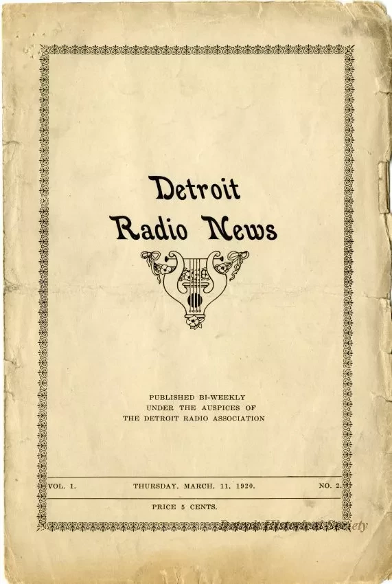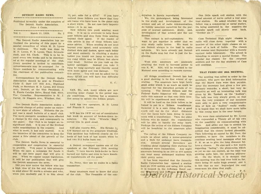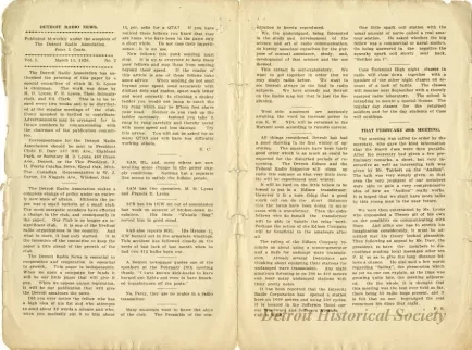 Thursday, March 11, 1920 edition of the Detroit Radio News published by the Detroit Radio Association containing news relating to Detroit-area amateur radio enthusiasts, including etiquette, news about users equipment troubles, radio classes at Cass Technical High ending due to lack of funding, and a meeting during which member proposed that radio communication with Mars is possible. The newsletter was printed by Wassmus Printing House at 657 Chene Street.
