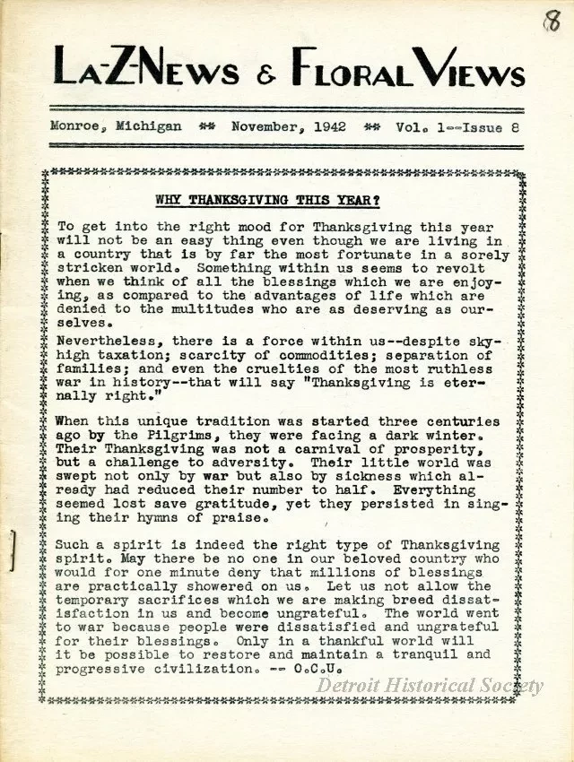 One copy of the "La-Z-News & Floral Views" newsletter for employees of the La-Z-Boy Chair Company and the Floral City Furniture Company. The typewritten newsletter, dated November, 1942, is 12 pages in length and contains company announcements as well as information about upcoming/recent events, new employees, retirements, and humorous short stories.