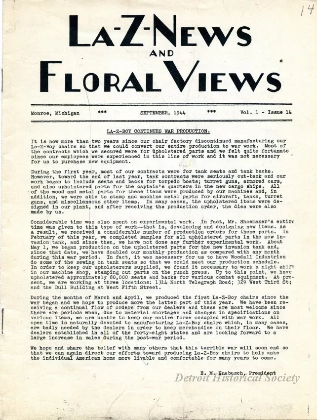 One copy of the "La-Z-News & Floral Views" newsletter for employees of the La-Z-Boy Chair Company and the Floral City Furniture Company. The typewritten newsletter, dated September, 1944, is 16 pages in length and contains company announcements as well as information about upcoming/recent events, new employees, retirements, and humorous short stories. Several black and white photographic images are included with the text.