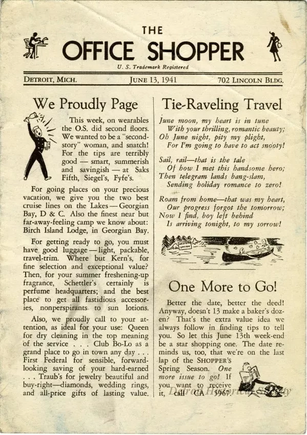 June 13, 1941 issue of The Office Shopper, a newsletter containing advertisements for Detroit retailers and businesses including, R.H. Fyfe and Company, the Ernst Kern Company, the Georgian Bay Line, Saks FIfth Avenue, Schettler's, the Detroit and Cleveland Lake Lines, the B. Siegel Company, Club Bob-lo, the First Federal Savings and Loan Association, the Birch Island Lodge, Queen Cleaners and Dyers, and Traub Brothers and Company. The masthead lists the newsletter as being published from 702 Lincoln Building.