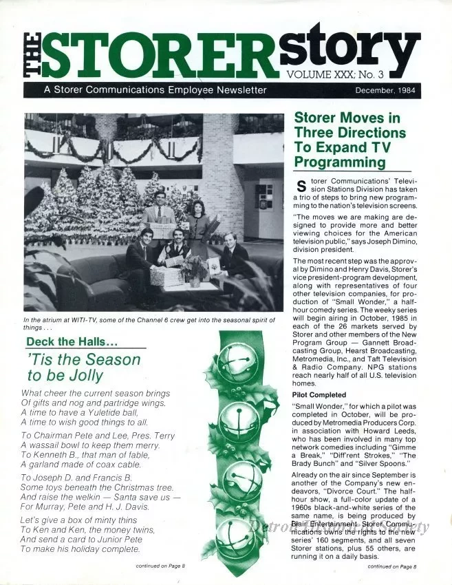 One copy of the employee monthly newsletter, "The Storer Story," dated December, 1984, for employees of the Storer Broadcasting Company. The newsletter is printed in green and black text on white paper and features 8 pages of short articles about people and events at company radio and television stations. Many black and white photographs are included with the text. WJBK (Detroit) is mentioned in several articles.