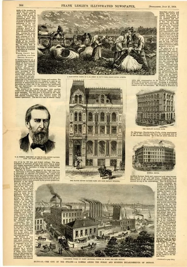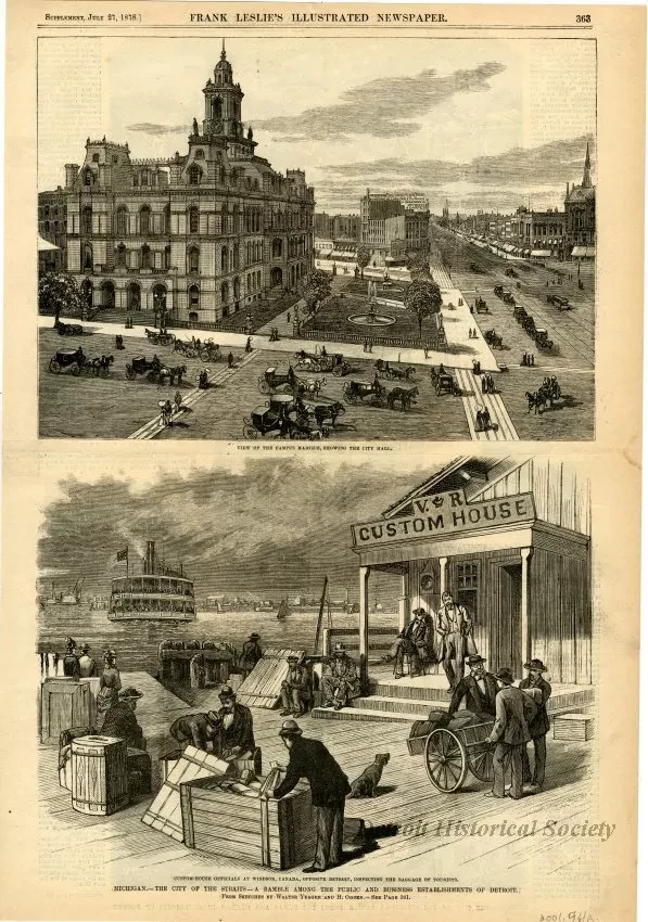 One sheet, containing pages 363 and 364, from the July 27, 1878 supplement to Frank Leslie's Illustrated Newspaper. Page 363 contains two etchings representing "Michigan.-The City of the Straits-A Ramble Among the Public and Business Establishments of Detroit. From sketches by Walter Yeager and H. Ogden." The captions for the two etchings are as follows: Upper: View of the Campus Martius, Showing the City Hall. Lower: Custom-House Officials at Windsor, Canada, Opposite Detroit, Inspecting the Baggage of Tourists. Page 364 contains the continuation of an article from page 362, "The City of the Straits: Rambles About A Thrifty Western Metropolis." Page 364 contains a section about "Wayne County Savings Bank and Safe Deposit Building," in addition to five etchings with the same theme, "A Ramble Among the Public and Business Establishments of Detroit," as those on page 363. The captions for the etchings on page 364 are as follows: Upper-middle: A Harvesting Scene on D.M. Ferry & Co.' Farm, Grand River Avenue. Left-center: W.B. Wesson, President of the Wayne County Savings Bank and Deposit Company. Mid-center: The Wayne County Savings Bank and Safe Deposit Building. Upper right-center: The People's Savings Bank. Lower right-center: Russell House. Lower-middle: Varnishing Works of Berry Brothers, Corner of Wight and Lieb Streets.