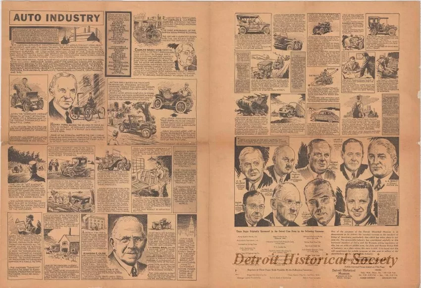One 2-page newspaper article entitled "Auto Industry." The article is printed in a cartoon style that has black text along with black and white drawings on yellowed paper. The article gives a brief history of the auto industry in Detroit from Charles Brady King in 1896 down to the present industry leaders in 1951. The article was sponsored by various companies that have been listed near the bottom of the second page. The article was printed in the Detroit Free Press in conjunction with an automotive history exhibit at the Detroit Historical Museum. Small printed text near the left center area of the text shows "Copyright 1951 by E. and I. Geller."