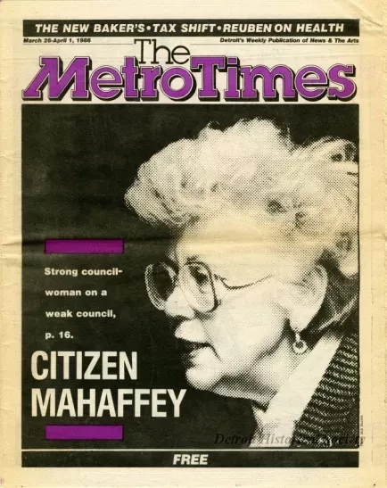 Newspaper. One copy of The Metro Times, Vol. VI, No. 23, dated March 26 - April 1, 1986. The cover shows a photograph of Detroit City Councilor Maryann Mahaffey, taken by Bob Buchta, with headline reading "Strong council-woman on a weak council, p. 16. CITIZEN MAHAFFEY." The headline at the top of the cover reads "The New Baker's," "Tax Shift," and "Reuben on Health." Includes an article about Belle Isle renovation plans, and book, film and music reviews.