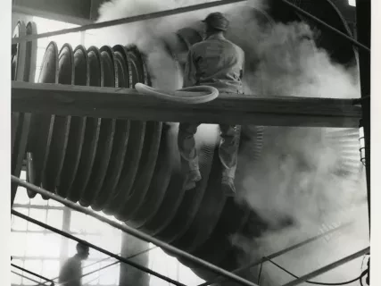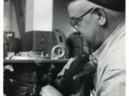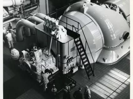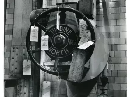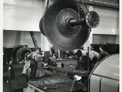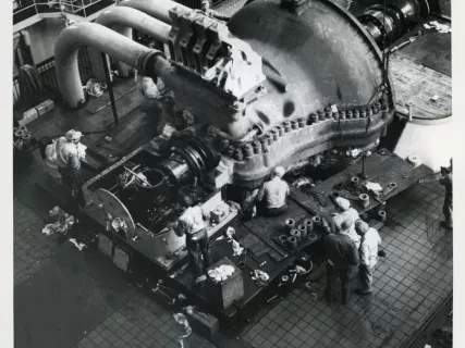 One newspaper article entitled "Turbine Take-Down; Mighty Machine is Overhauled at Edison Power Plant." The article is printed in black text on slightly yellowed paper and includes black and white pictures. It offers a brief description about the process of disassembling a steam turbine generating unit at the Detroit Edison Delray electric power plant for maintenance and repair. The article appeared on pages 12 and 13 of the Detroit Free Press Roto Magazine on Sunday, November 2, 1952.