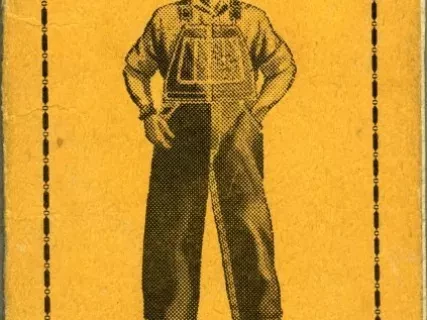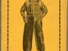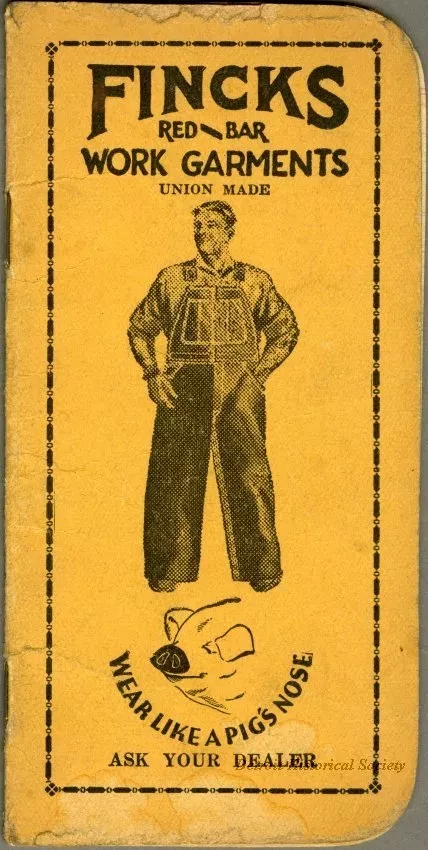 Pocket-sized notebook staple-bound in a yellow cover advertising W.M. Finck and Company's overalls. The front cover features the Fincks Red Bar Work Garments logo above an illustration of a man in overalls and an illustration of a pig's face surrounded by the text, "Wear Like A Pig's Nose. Ask Your Dealer." The back cover features the Fincks Red Bar Carpenter's Special logo above an illustration of a man in overalls and a hat beside the text, "17 Big Pockets. All Heavily Reinforced." The front cover's image is reproduced inside the front cover with sixteen numbered arrows pointing to the overalls' "points of superiority" as explained in the copy above the image. A calendar for 1944 and 1945 is printed inside the back cover. Unused pages of lined paper are contained in between the cover.