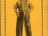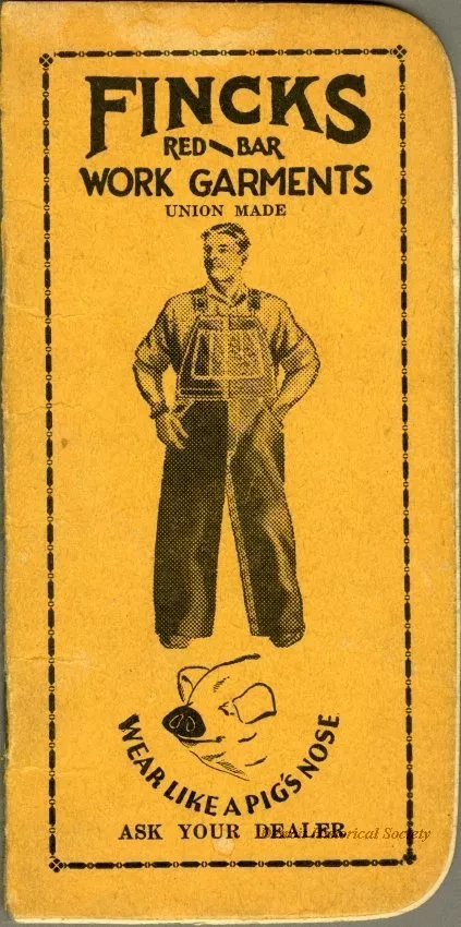 Pocket-sized notebook staple-bound in a yellow cover advertising W.M. Finck and Company's overalls. The front cover features the Fincks Red Bar Work Garments logo above an illustration of a man in overalls and an illustration of a pig's face surrounded by the text, "Wear Like A Pig's Nose. Ask Your Dealer." The back cover features the Fincks Red Bar Carpenter's Special logo above an illustration of a man in overalls and a hat beside the text, "17 Big Pockets. All Heavily Reinforced." The front cover's image is reproduced inside the front cover with sixteen numbered arrows pointing to the overalls' "points of superiority" as explained in the copy above the image. A calendar for 1945 and 1946 is printed inside the back cover. Unused pages of lined paper are contained in between the cover.