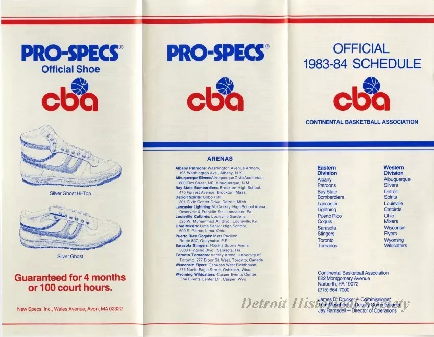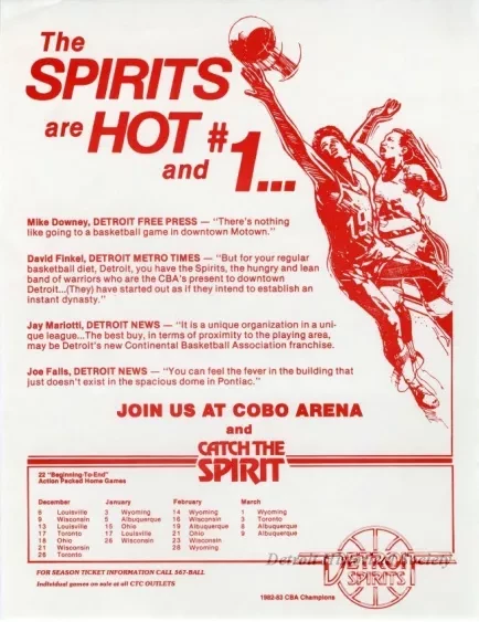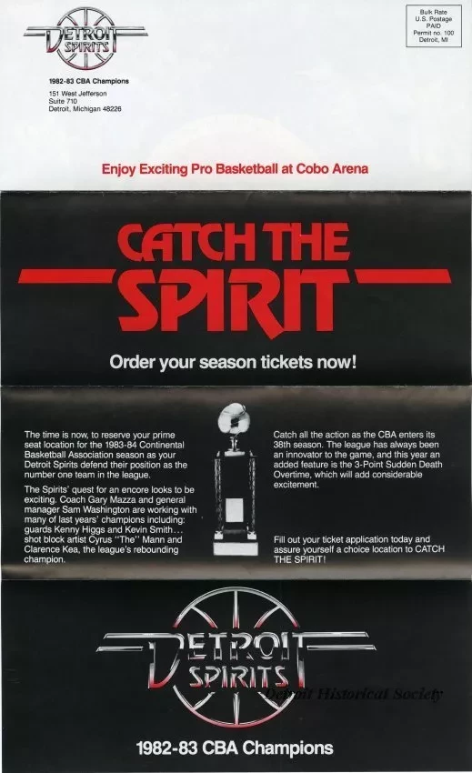 Two-pocket folder containing a schedule promotional flyers and ticket information for the Detroit Spirits of the CBA.